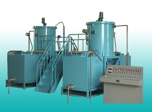 本裝置是粉狀(或液態)高分子凝絮劑的全自動連續配置及投加系統。干粉絮凝劑從螺旋推進器內進入預混器與清水進行預混,被濕潤的物料進入配制槽進行稀釋,按要求濃度進行配制;若為液態絮凝劑則由螺桿泵直接投加到配制槽中。